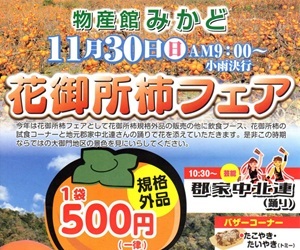 今年は花御所柿フェアとして花御所柿規格外品の販売の他に飲食ブース、 花御所柿の試食コーナーと地元郡家中北連さんの踊りで花を添えていただきます。 是非この時期 ならではの大御門地区の景色を見にいらしてください。