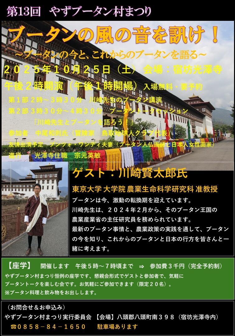 やずブータン村まつり恒例の座学です。 懇親会形式でゲストと参加者で、気軽に ブータントークを楽しむ会です。 お気軽にご参加できます (限定20名)。※ブータン料理と飲み物をお出しします。