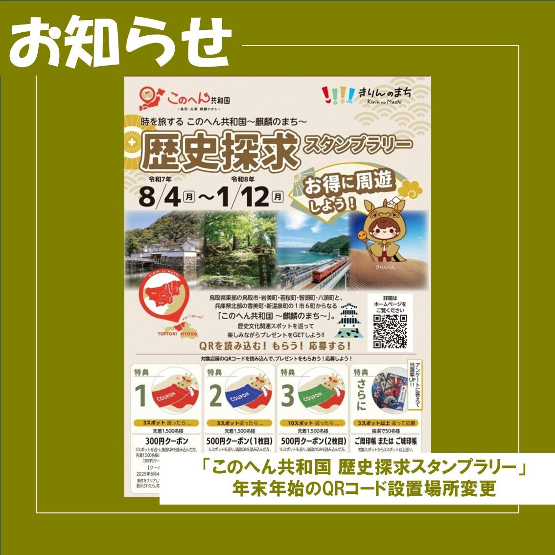 現在開催中の「このへん共和国 歴史探求スタンプラリー」について、郡家駅コミュニティ施設 ぷらっとぴあ・やずの閉館に伴い、年末年始の…