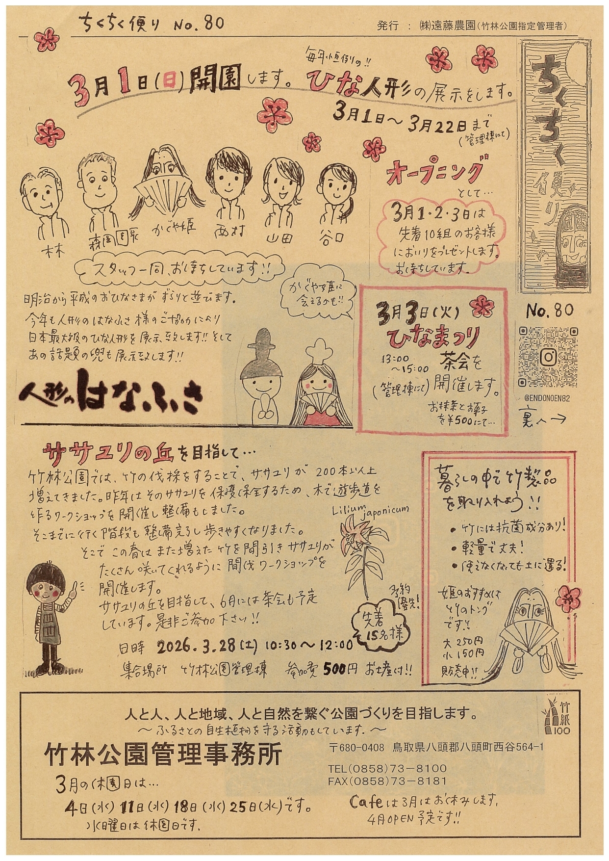 船岡竹林公園管理事務所よりお知らせです。今回の「ちくちく便り」では、次の内容をご紹介しています。 1.3月1日(日) 開園 &…