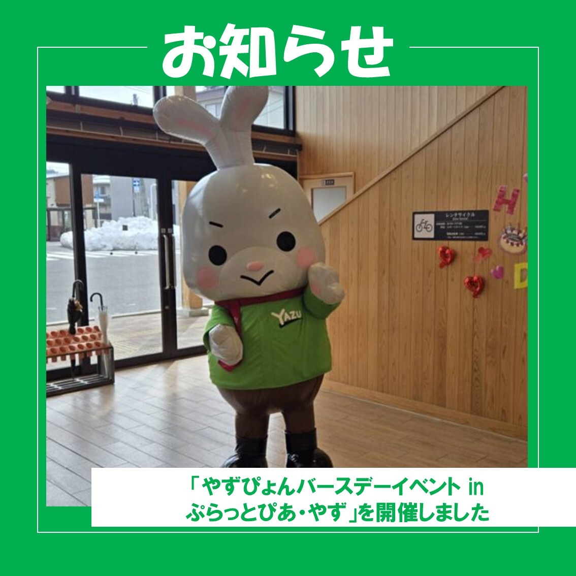 今年もプレゼントをもらったやずぴょん♡ 2月14日はやずぴょんのお誕生日♪ 本日、郡家駅コミュニティ施設「ぷらっとぴあ…