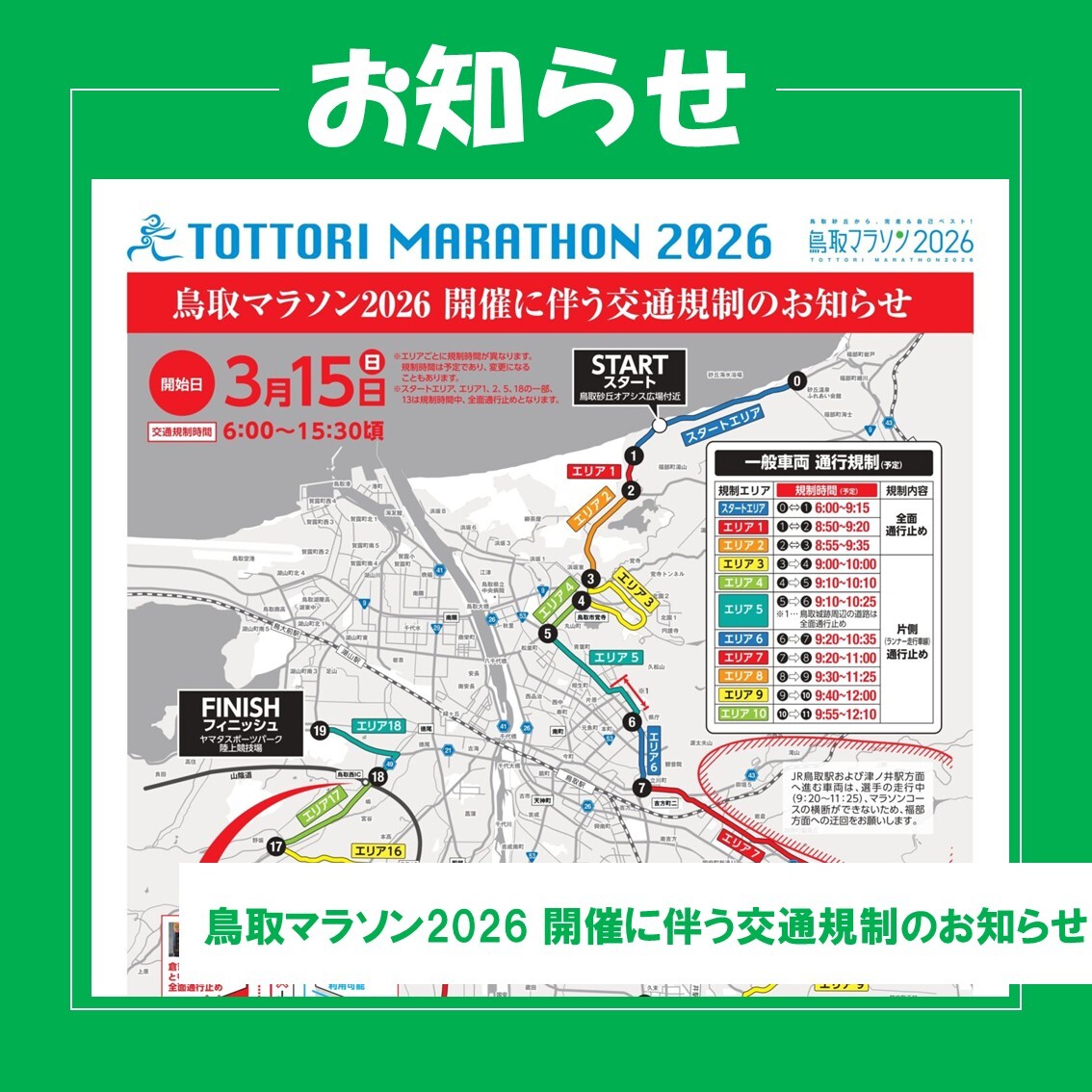 2026年3月15日(日)に開催される 「鳥取マラソン2026」 に伴い、マラソンコースとなる鳥取市内で交通規制が実施されます。鳥取東部お…