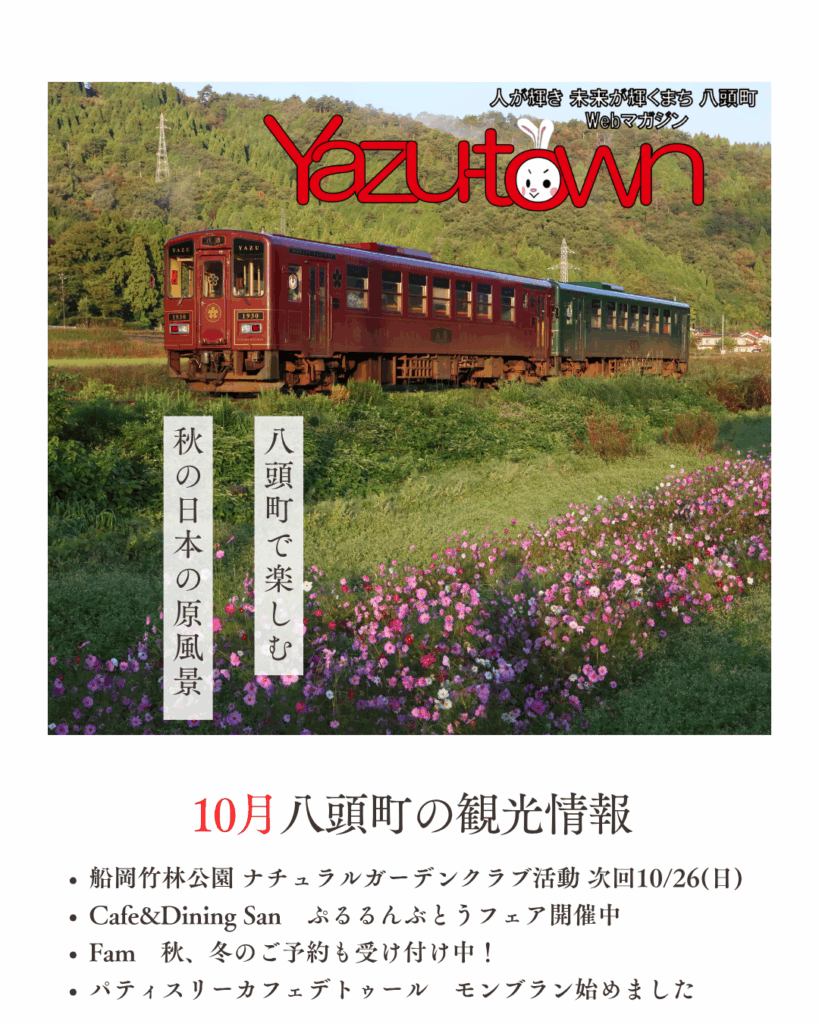 すっかり秋を感じる鳥取県八頭町では、秋のイベントが盛りだくさんです。八東総合運動公園で開催する「八頭町マルシェ」や船岡竹林公園で開催の「うさのわ」、遠見山馬酔木の会と丹比地区公民館が主催する「第24回 遠見山登山」など秋を感じる行事が続きます。「うさぎめぐりデジタルスタンプラリー25」や「ルート29スタンプラリー」に参加しながら八頭町を楽しんでみるのはいかがでしょうか?