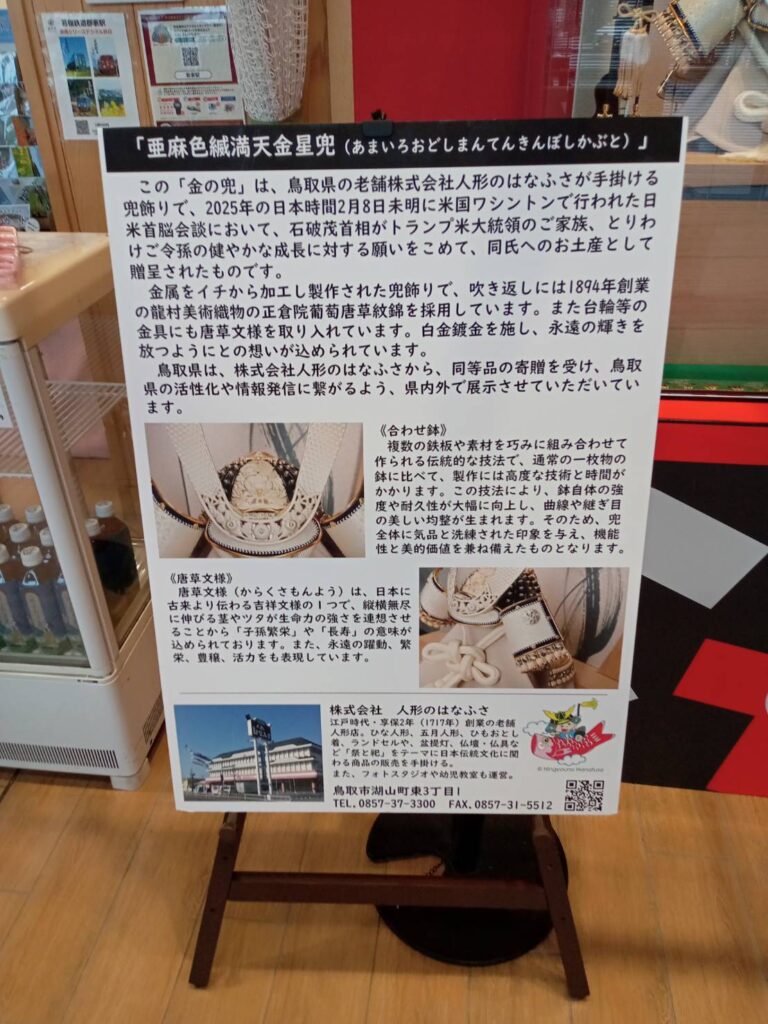 郡家駅コミュニティ施設「ぷらっとぴあ・やず」で、黄金の兜が展示されています。この兜は、米国ワシントンで現地時間2025年2月7日(日本時間2月8日未明)に行われた日米首脳会談の際、石破茂元首相からトランプ米大統領へ「ご家族、とりわけお孫さまの健やかな成長を願って」贈られたものと同じ兜です。 兜を手がけたのは、鳥取県の老舗人形店「株式会社人形のはなふさ」。同店の代表作「亜麻色縅満天金星兜(あまいろおどしまんてんきんぼしかぶと)」が選ばれました。