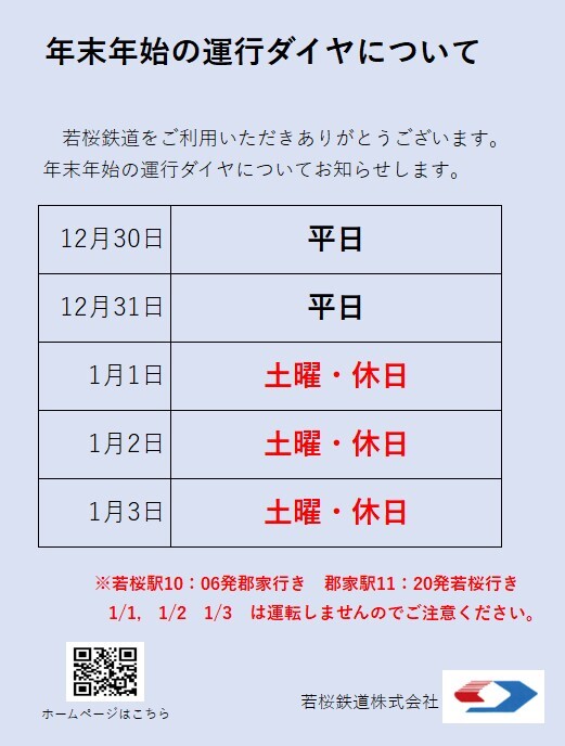 若桜鉄道年末年始のダイヤについて 2025年12月25日お知らせ 若桜鉄道株式会社からお知らせです。平素より若桜鉄道をご利用いただきましてありがとうございます。令和8年1月1日~3日は、休日ダイヤで運行いたします。ご利用の際にはご注意ください。 令和8年1月4日から通常通り運行いたします。 【外部リンク】若桜鉄道HP
