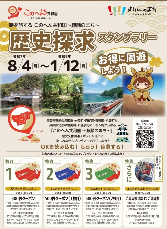 本スタンプラリーは、鳥取県東部の5エリア鳥取市・岩美町・若桜町・智頭町・八頭町と兵庫県北部の2エリア香美町・新温泉町の以上 7エリアの歴史スポットを巡り、ポイントを集めながら地域の新たな魅力を発見できる企画です。集めたポイントに応じてプレゼントもGETできます。