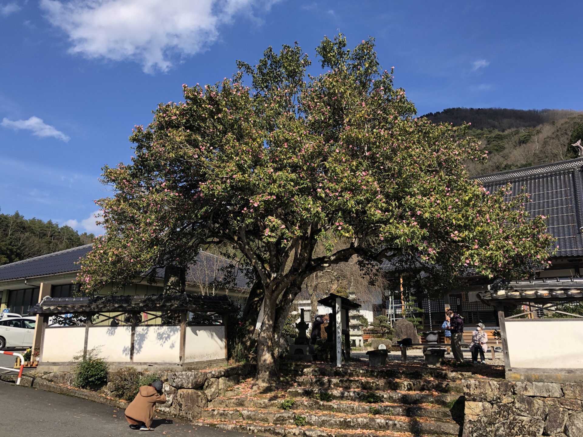 境内正面の石段左側に推定樹齢400年以上の大椿があります。この椿は関西では「有楽椿(うらくつばき)」、関東では「太郎冠者(たろうかじゃ)」と呼ばれ、茶人大名の織田有楽斎(おだうらくさい)が茶花として愛好した銘木です。樹高8.7メートル、幹回り1.85メートル、枝張り10.5メートルという巨木で、日本一の有楽椿といわれています。この銘木は[町指定記念物]です。