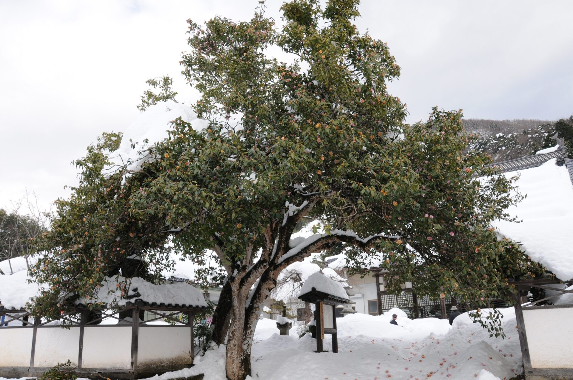 境内正面の石段左側に推定樹齢400年以上の大椿があります。この椿は関西では「有楽椿(うらくつばき)」、関東では「太郎冠者(たろうかじゃ)」と呼ばれ、茶人大名の織田有楽斎(おだうらくさい)が茶花として愛好した銘木です。樹高8.7メートル、幹回り1.85メートル、枝張り10.5メートルという巨木で、日本一の有楽椿といわれています。この銘木は[町指定記念物]です。